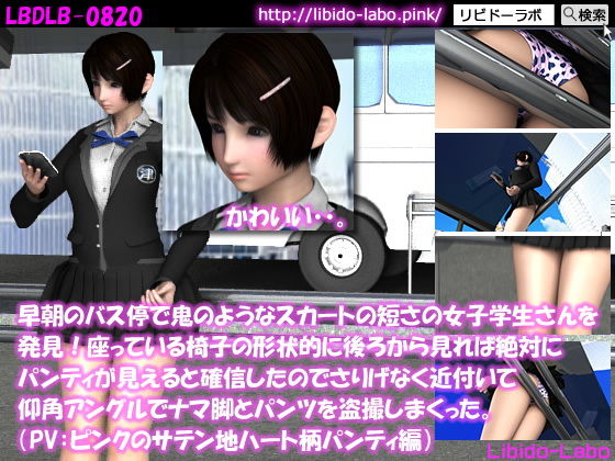 早朝のバス停で鬼のようなスカートの短さの女子学生さんを発見!座っている椅子の形状的に後ろから見れば絶対にパンティが見えると確信したのでさりげなく近付いて仰角アングルでナマ脚とパンツを盗撮しまくった。(PV:ピンク色サテン地ハート柄パンティ編)